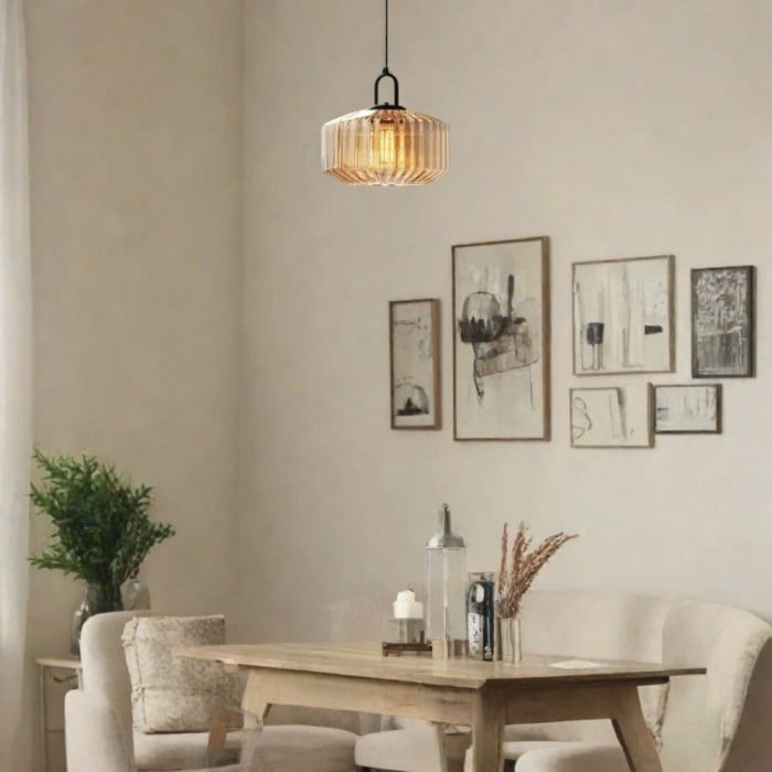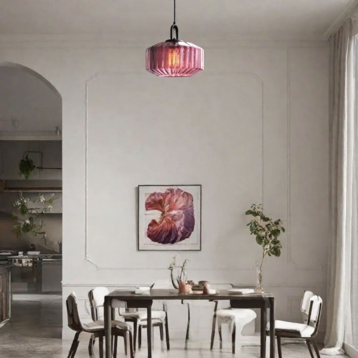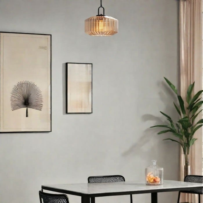 Die Pendelleuchte aus Rippenglas verleiht modernen Küchen mit ihrer geschwungenen Silhouette einen texturierten Charme. Sie ist perfekt für Kücheninseln oder über Arbeitsflächen, und die gerippte Oberfläche streut das Licht schön.