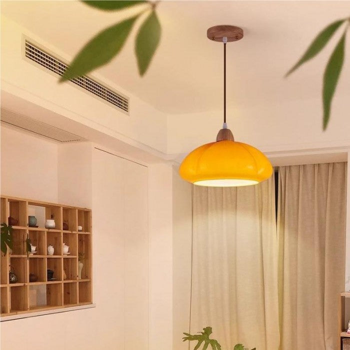Eine Nordic Retro orange Glas Pendelleuchte für die Küche. Dieses beeindruckende Stück ist mit einem Glasschirm und Holzmaterialien versehen. Die zarte Textur und die gleichmäßige Lichtstreuung, die durch den Glasschirm der Kürbis-Pendelleuchte abgegeben wird, schaffen sanftes, blendfreies Licht. Diese kreative Pendelleuchte, die mit einer E27-Fassung kompatibel ist, strahlt weiches, energieeffizientes Licht aus und verlängert die Lebensdauer der Glühbirne.